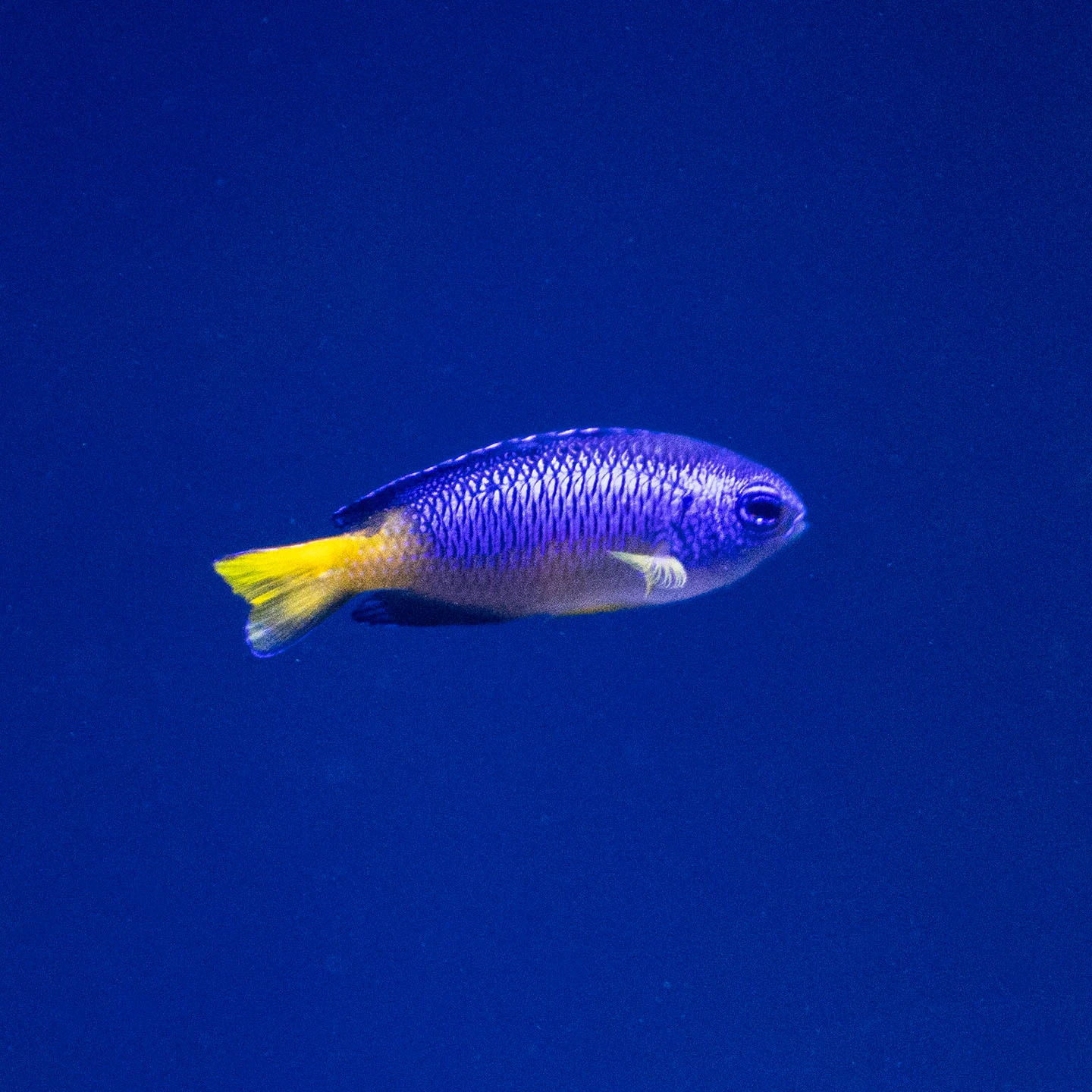 身體亮藍色,腹部、臀鰭、尾柄和尾鰭呈黃色