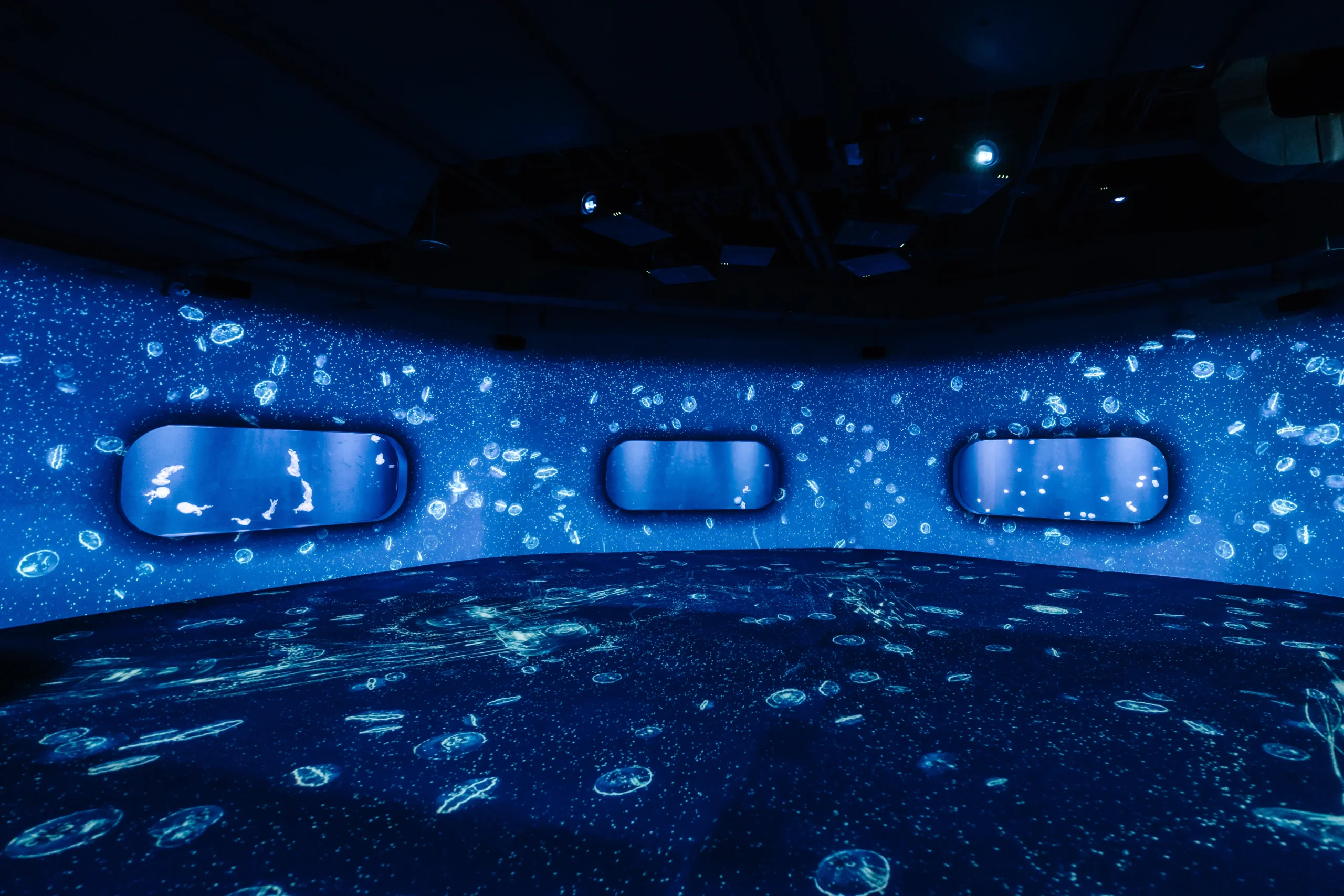 這裡擁有全國最大的水母展示缸,寬達8公尺,近5000隻海月水母優雅漂浮。電子投影技術讓水母影像延伸至腳邊,營造如同置身海中、與水母一同漂浮的沉浸式體驗。遊客也能輕觸投影水母,享受夢幻互動,成為全館最受歡迎的拍照景點。