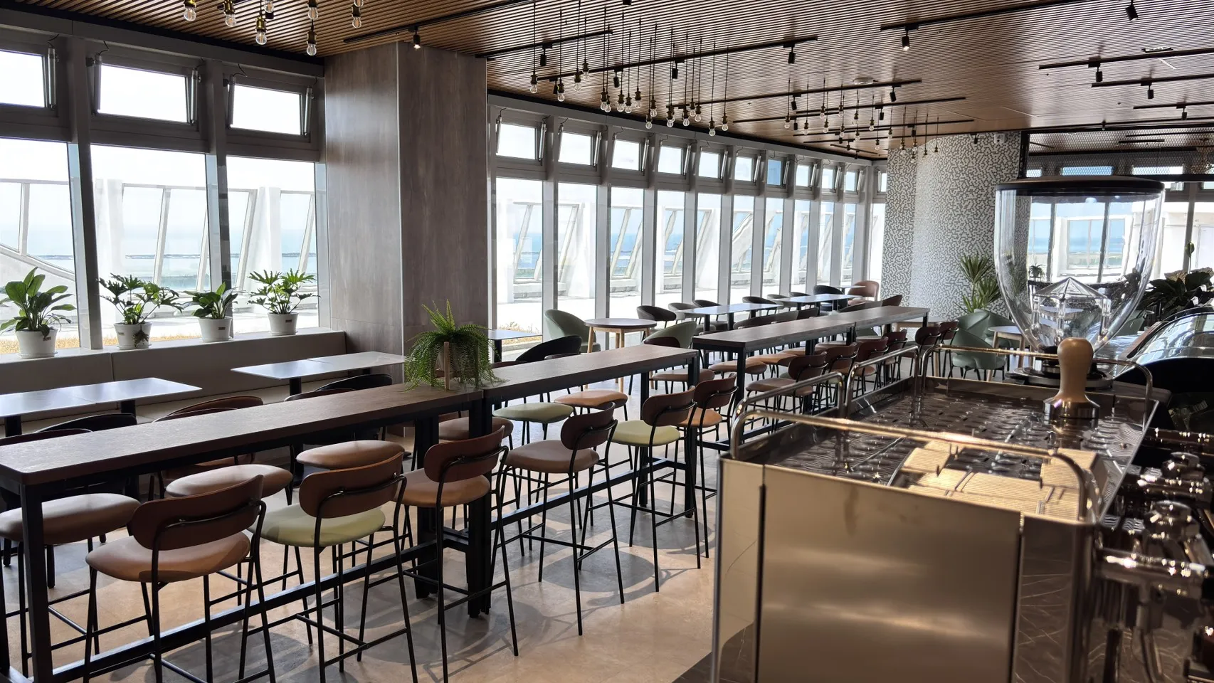 位於台中海洋館頂樓的景觀咖啡廳,三面落地窗採光明亮,讓您在舒適宜人的空間中,一邊品嚐各式咖啡、飲品與輕食,一邊眺望台中港的遼闊海景,享受陽光灑落窗邊的悠閒時光。走出戶外觀景台,遠方高美濕地隨風轉動的風車、台中港區的船帆以及海天一色的湛藍景致盡收眼底,幸運的話,還能透過望遠鏡看見外海鯨豚悠然躍出水面的珍貴畫面。這裡不僅是充分享受海岸美景的最佳去處,也是旅人與網美拍照打卡的熱門景點。