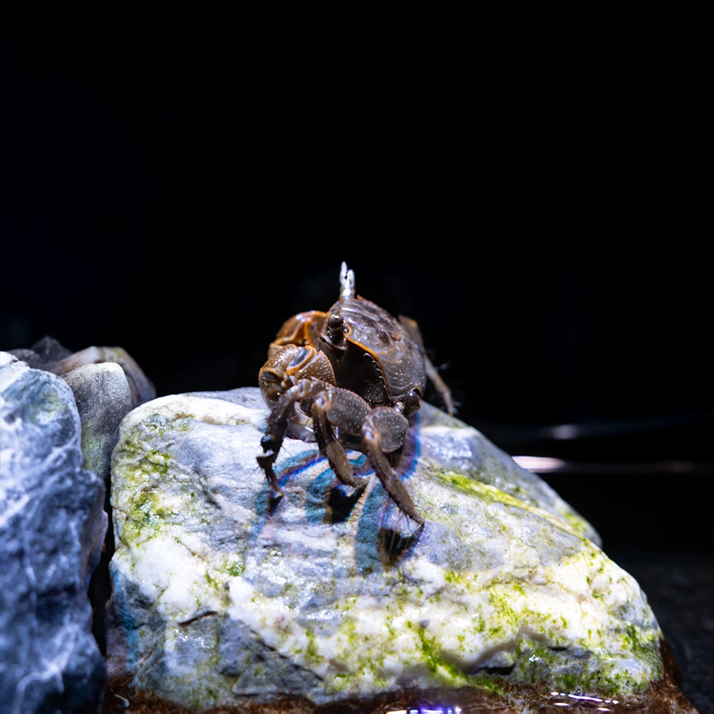 頭胸甲方形,茶褐色;背甲呈黑色的雙腳交叉