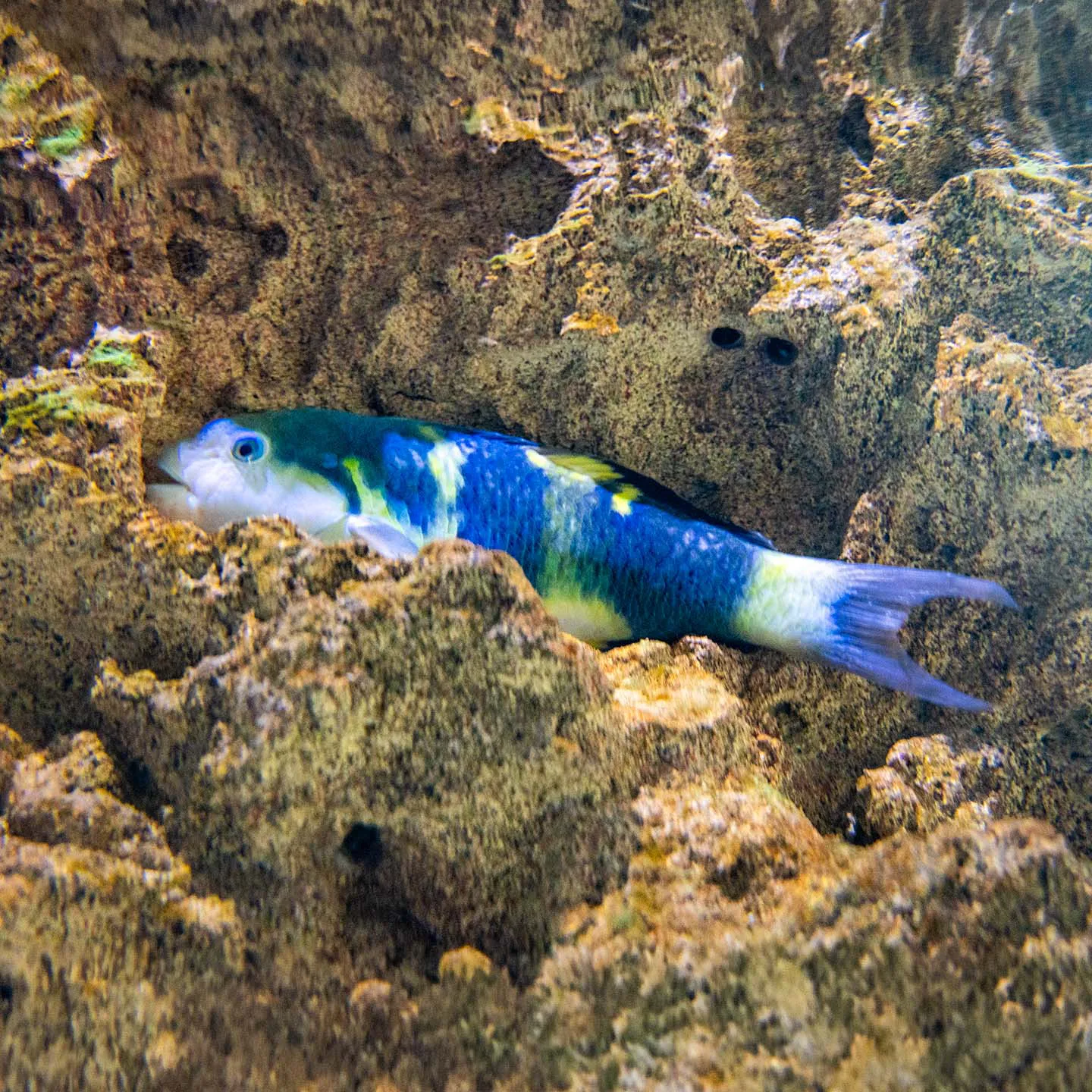 身體呈淺藍色。 主要棲息於清澈隱蔽的潟湖