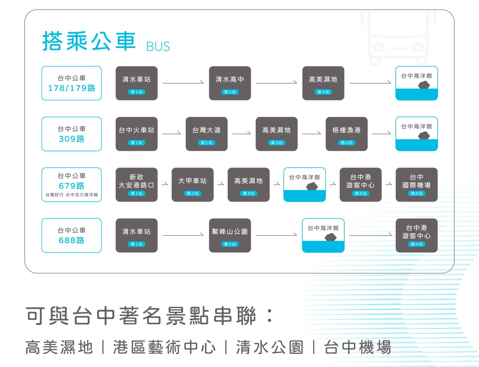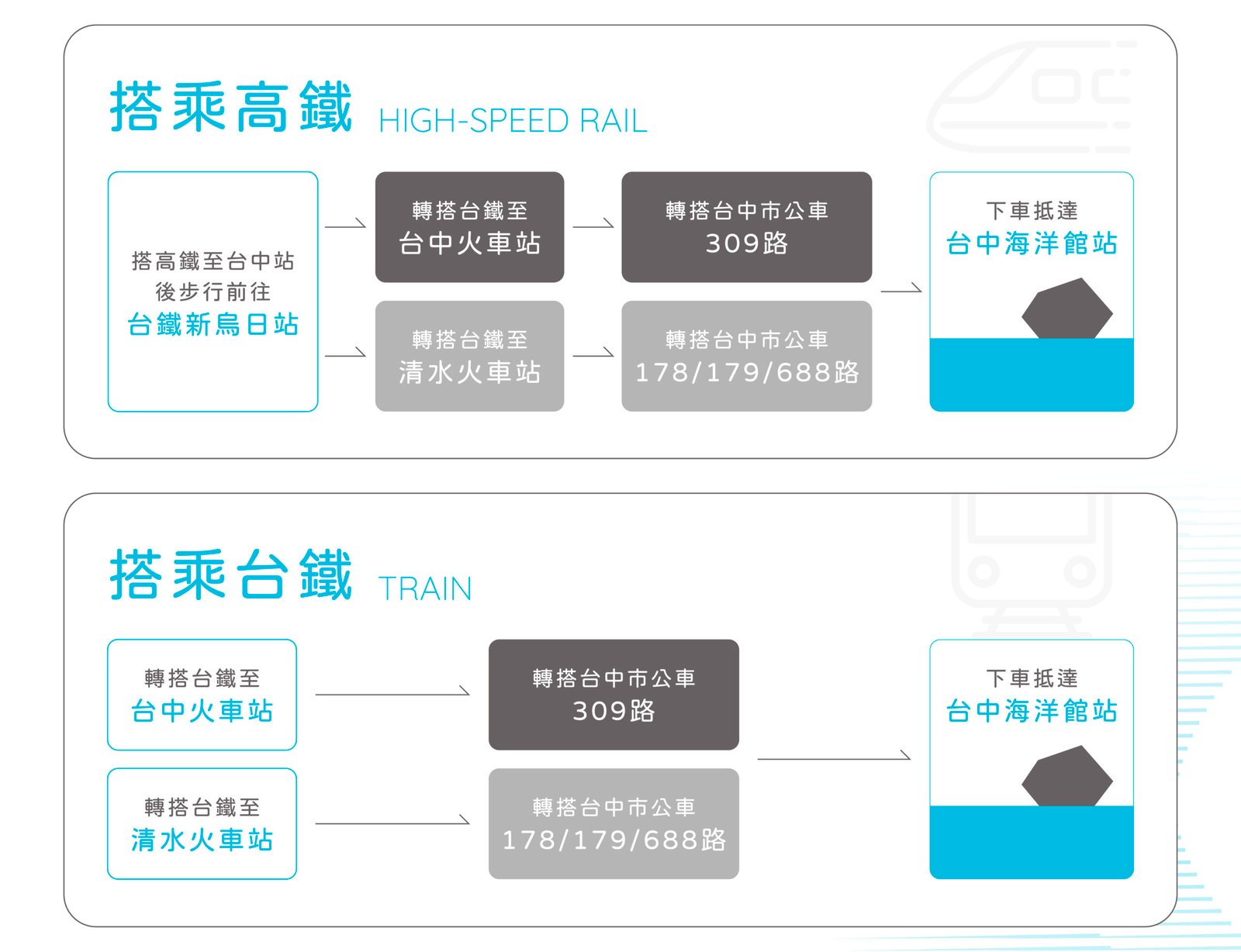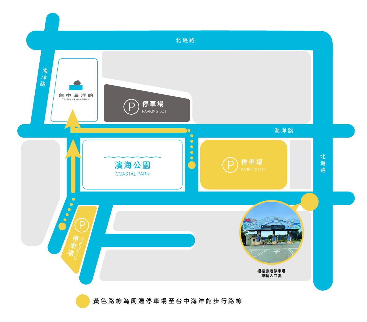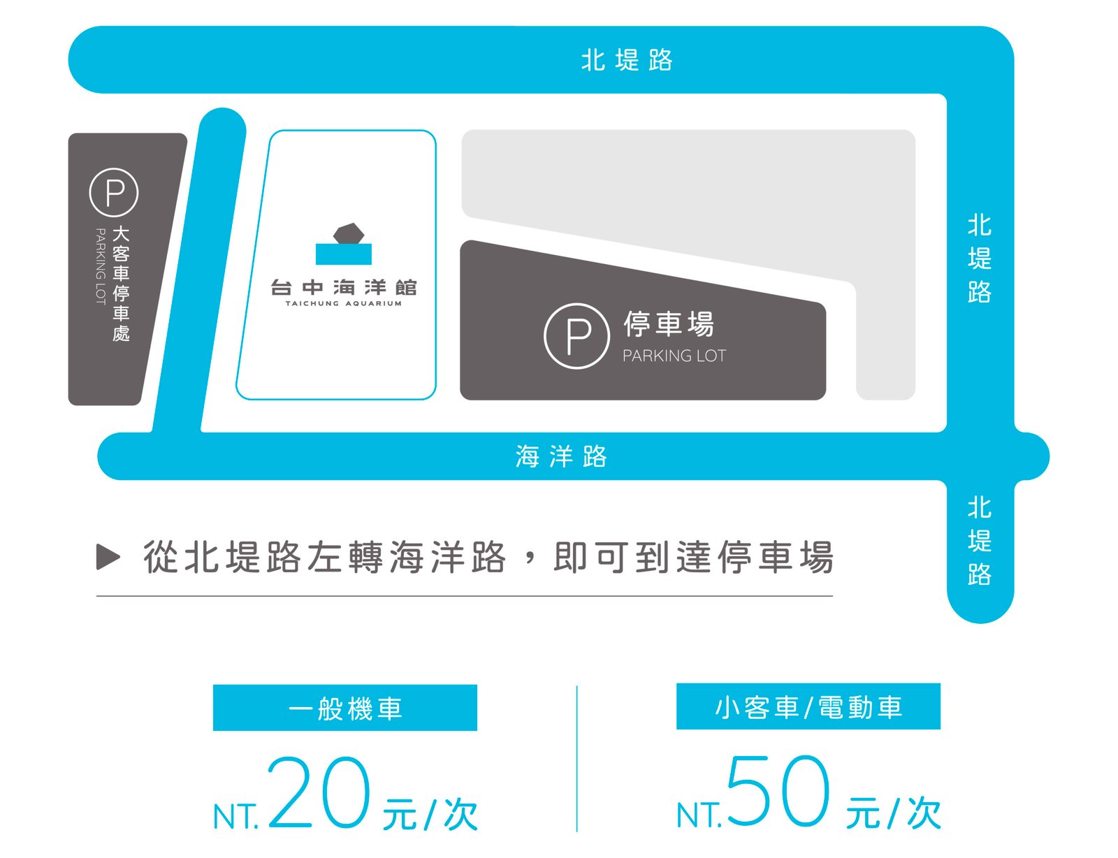 Direction 位置資訊 台中海洋館擁有絕佳的地理位置與完善的交通規劃,讓每位前來的遊客都能輕鬆抵達。無論是來自外地或本地,您都可以選擇最適合的交通方式前往:從機場出發可搭乘專車直達,亦可透過高鐵、火車、公車等多元大眾運輸工具到站後轉乘前往,路線清晰方便。而對於自行開車的旅客,台中海洋館也貼心設有專用停車場,不論是家庭出遊還是朋友結伴,都能享有順暢愉快的交通體驗。 地址|台中市清水區海洋路168號 Public transportation & Parking 交通資訊 大眾運輸 自行駕車 若館內附設停車場滿位時,建議您可停放置鄰近梧棲漁港停車場(如下圖黃色區域),其停車場車輛入口處為北堤路,步行時間約8-10分鐘